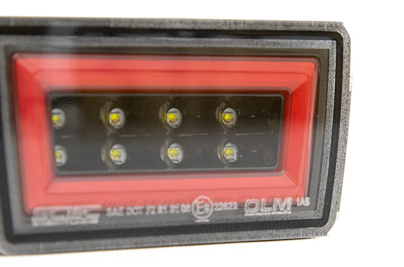 All-in-One Lighting: Combines brake light, reverse light, parking lamp (white square or red bar), and rear fog into a single unit.