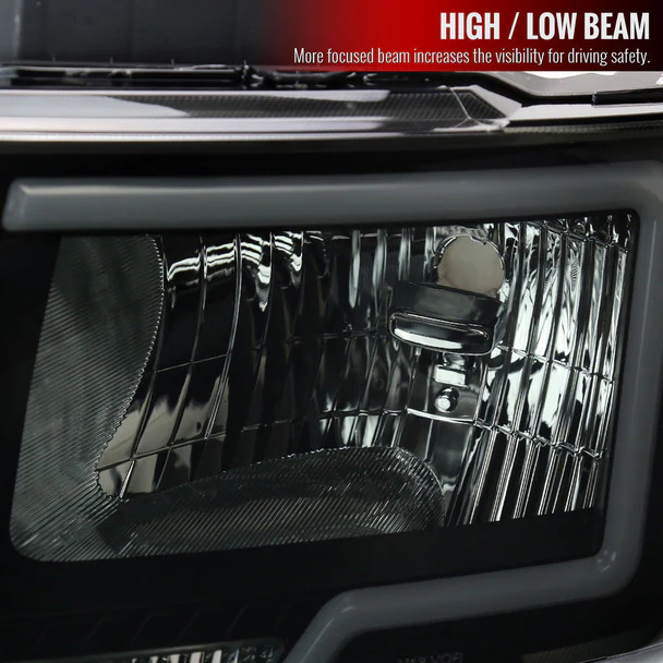 Upgrade your 2009-2014 Ford F-150 with these LED Bar Factory Style Headlights that combine sleek design with enhanced functionality. The bold smoked lens and amber reflectors not only provide a sharp, aggressive look but also improve road visibility for safer nighttime driving. Designed with durable black housing, these headlights are built to withstand the elements while seamlessly complementing your truck’s rugged style.