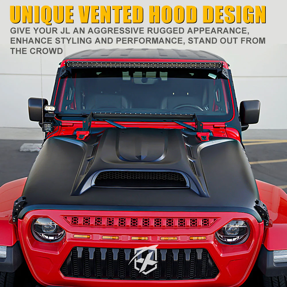 Elevate your Jeep Wrangler JL's performance and aesthetics with the Xprite Piranha Series Hood, meticulously designed for enhanced functionality and style. This innovative hood boasts a fully operational Ram Air System that not only improves performance but also incorporates Functional Heat Extractors for a heightened cool air flow experience. Crafted from high-quality steel/metal, the Piranha Series Hood undergoes rigorous factory QC testing, ensuring top-notch quality and a seamless match with original mounting holes. Replacing the original hood is a breeze, requiring no drilling, and the engineered design enhances ventilation, contributing to improved engine cooling. The Real Open Air Hood Scoop with Side Vents adds a touch of authenticity, providing both visual appeal and optimal airflow for your Jeep.
